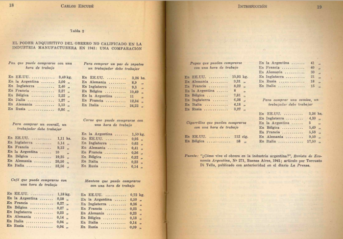En 1941 Torcuato di Tella publicó un artículo en la Revista de Economía Argentina (“Cómo vive el obrero de la industria argentina?” Año 23, Tomo 40, No. 271, enero 1941) con una comparación del poder adquisitivo del obrero no calificado en Argentina en relación a otros países. No es fácil conseguir el original, pero Carlos Escudé resumió sus conclusiones en su libro “Estados Unidos, Gran Bretaña y la declinación argentina 1942-1949“. A continuación reproduzco las páginas relevantes de este libro;