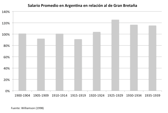 Más recientemente, en 1998, Jeffrey Williamson de Harvard, publicó un estudio de los salarios reales en América Latina en relación a los de Gran Bretaña hasta la Segunda Guerra Mundial. Argentina era el país con los salarios más altos de la región y como se puede apreciar en el gráfico, incluso superaban a los de los obreros ingleses: