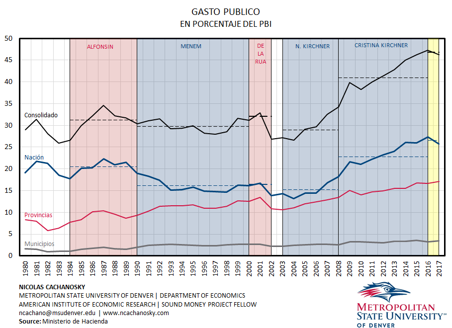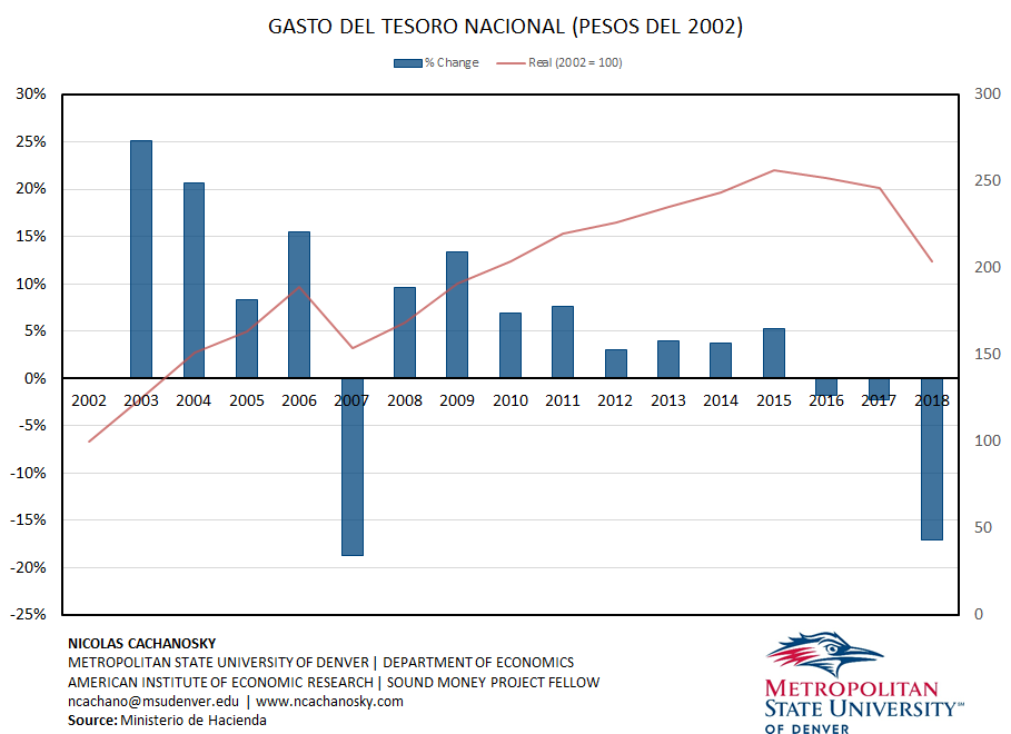 Salvo la crisis del 2007, el kirchnerismo ha aumentado de manera consistente el gasto en términos reales. El problema de la deuda es un problema de nivel de gasto. El problema de la deuda no se soluciona con un “reperfilamiento” o canje de bonos, se soluciona con una reforma del estado que disminuya el gasto a niveles sostenibles.